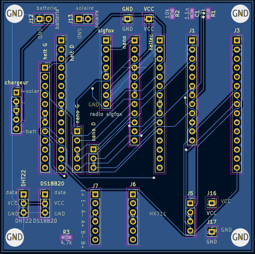 Le PCB intègre un circuit pour connecter un module de recharge d’un accumulateur via un panneau solaire. Cette fonctionnalité est particulièrement utile pour des installations autonomes en extérieur, comme des capteurs environnementaux ou des systèmes de surveillance.