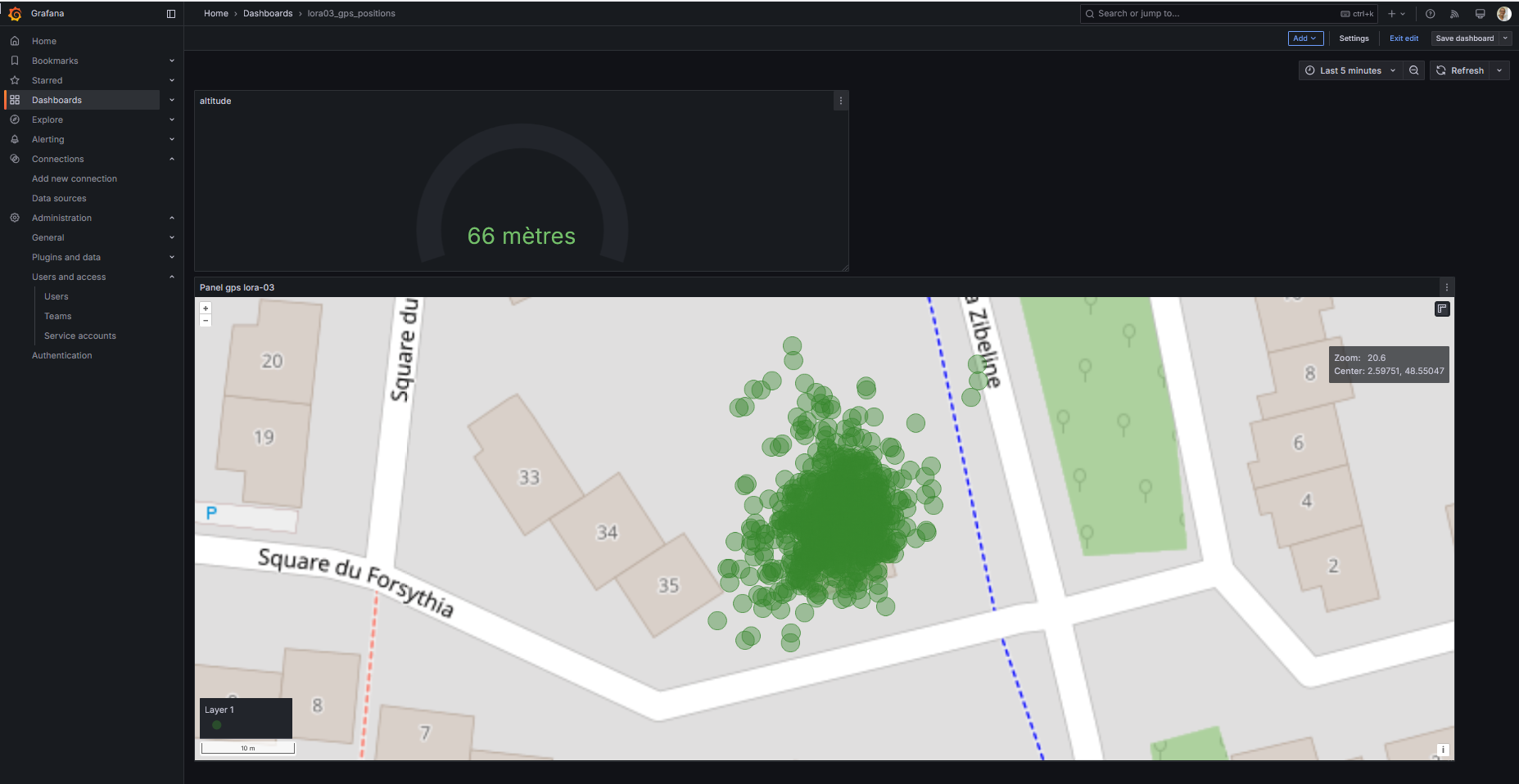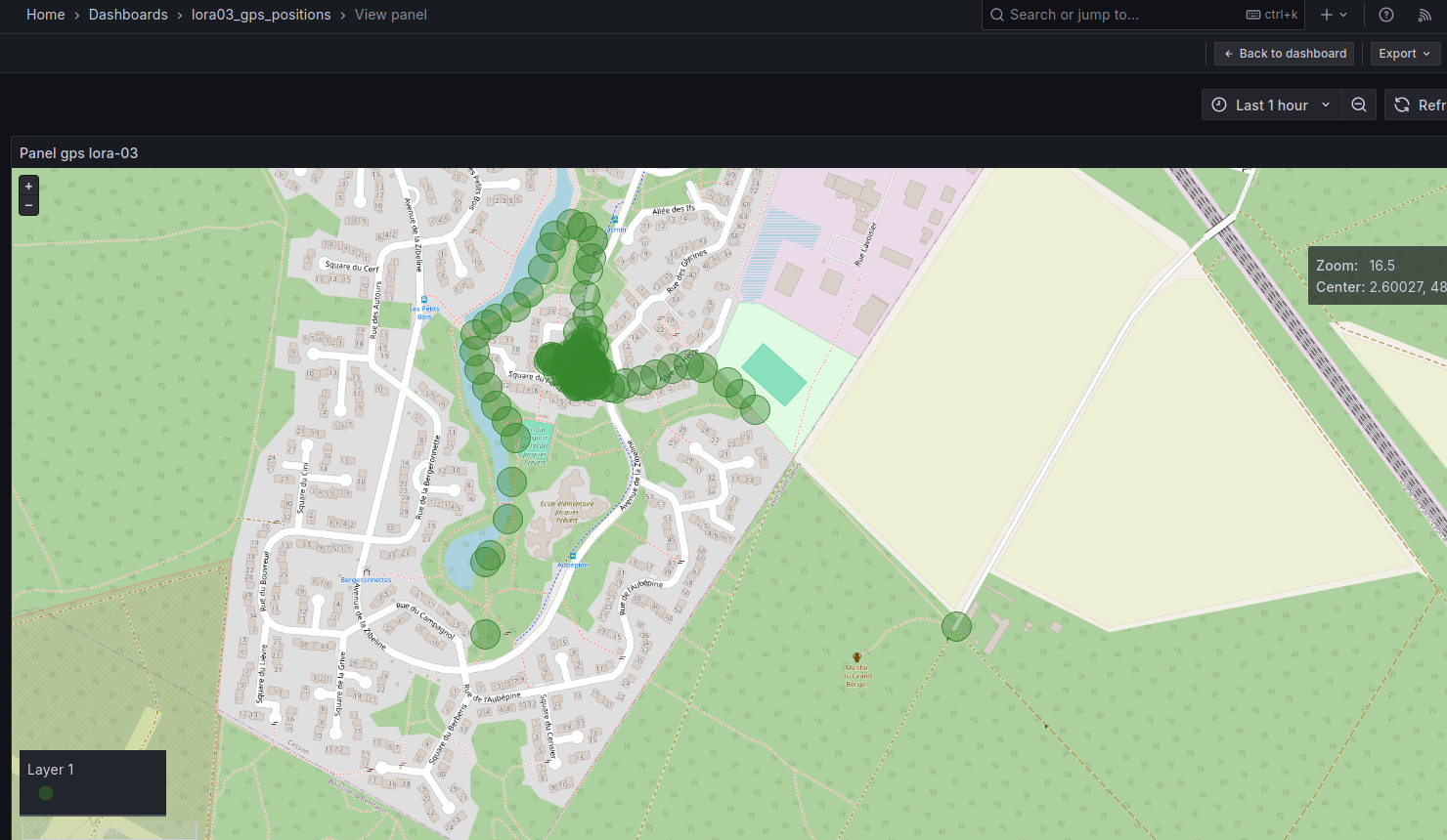 En bout de traitement de la trame, Grafana, grâce à son extension GéoMap, montrera une carte OpenStreetMap à un point horodaté montrant l’endroit où le système était localisé quand il a été reçu par une passerelle du maillage local.