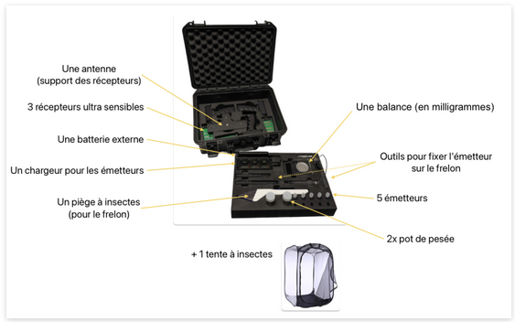 Traquer les frelons asiatiques avec une balise Bluetooth: système complet dans une valise avec outillage de capture, antennes directives et émetteurs embarqués, environ 2900€
