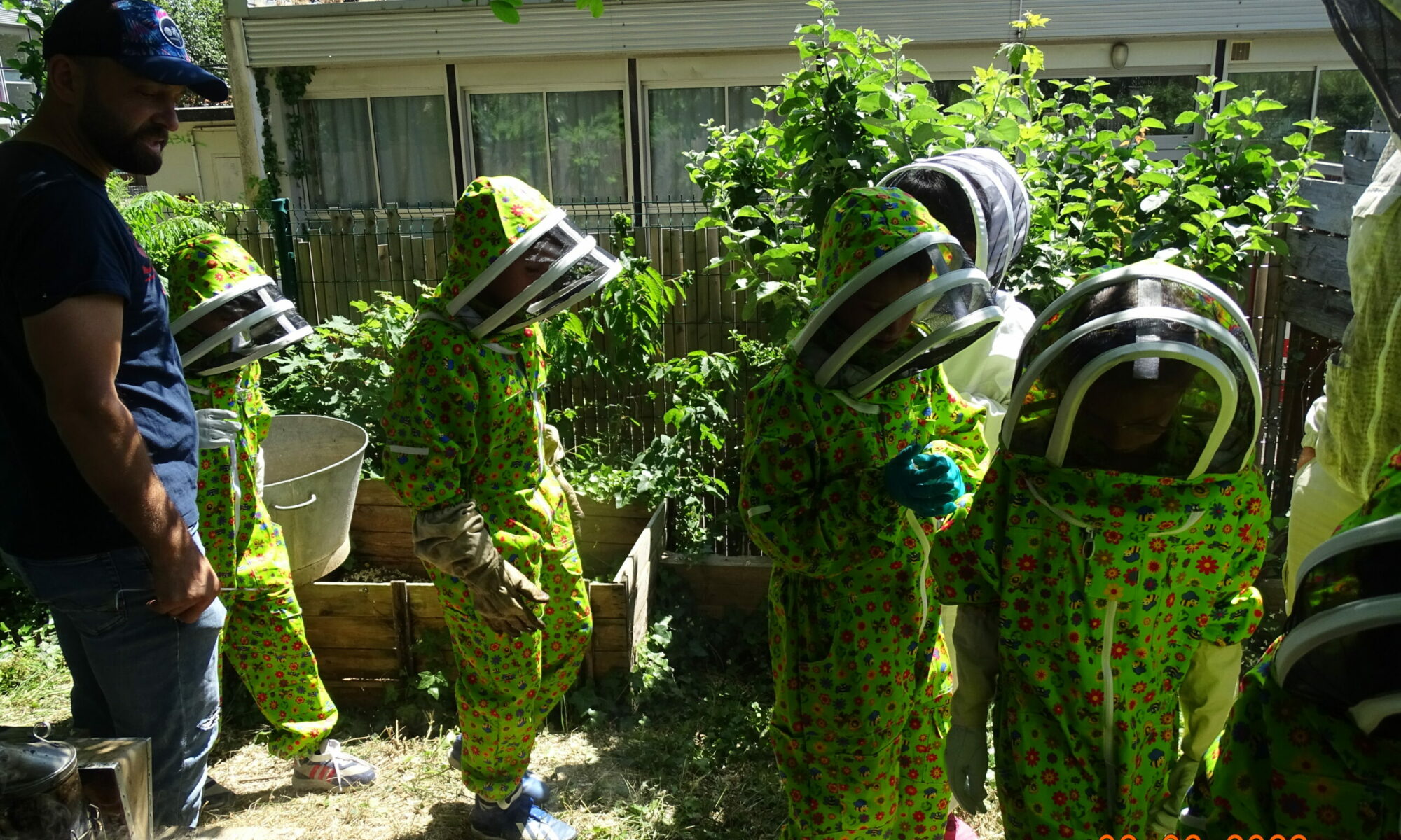 L’action s’est déroulée au jardin partagé de Nouveau Village. L’association avait équipé les élèves de petites tenues d’apiculteur multicolores.